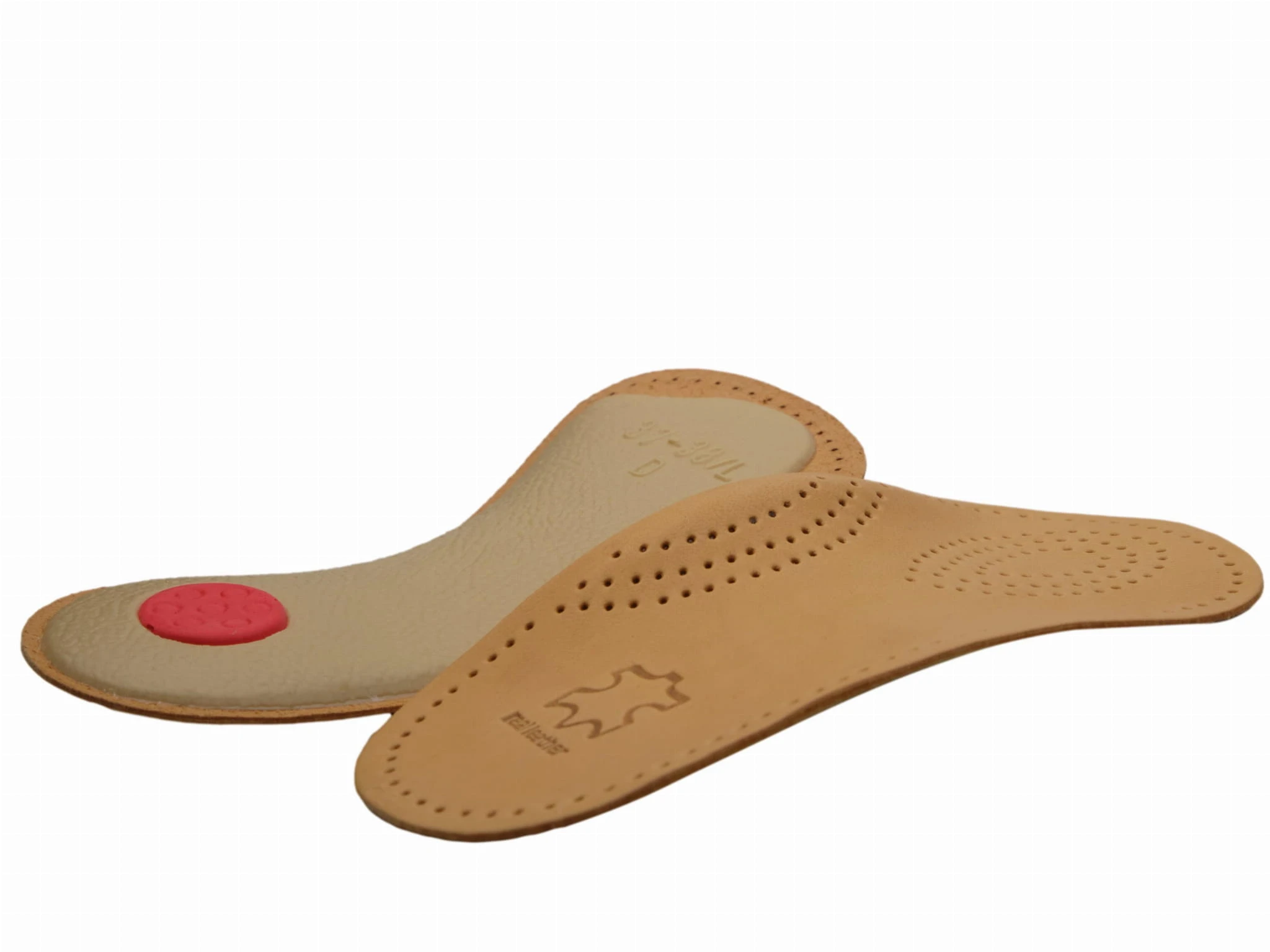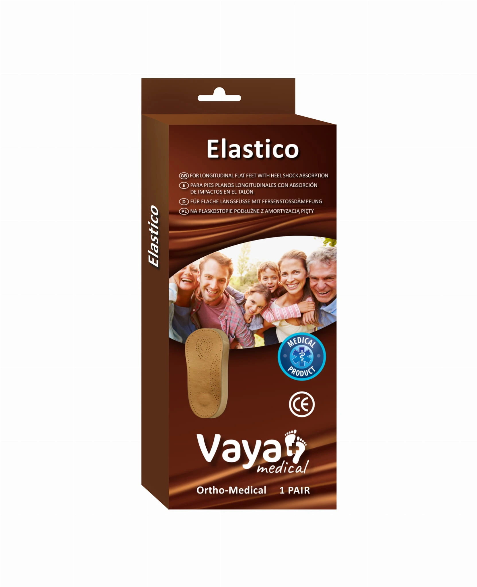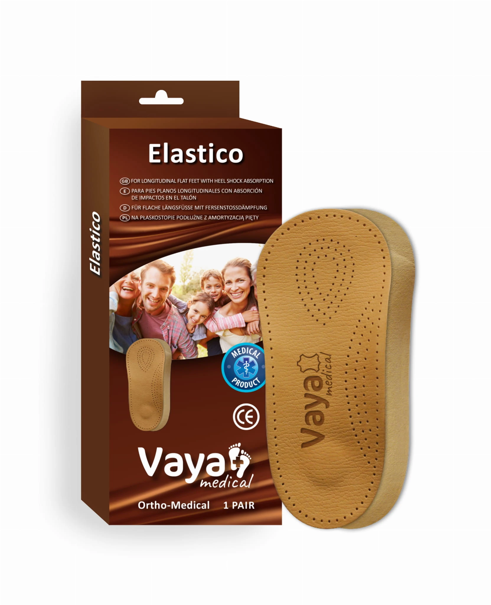 Vaya Elastico to skórzane wkładki typu 3/4 które zapewniają komfort stopom z płaskostopiem. Obniżenie fizjologicznego podłużnego łuku stopy, jakie występuje przy płaskostopiu podłużnym, jest redukowane dzięki korygującemu profilowi. Element ten podpiera łuk podłużny. Jeśli masz problem z płaskostopiem podłużnym, to proponowane wkładki Elastico będą dla Ciebie doskonałym rozwiązaniem. Zapobiegają opadaniu wysklepienia łuku podłużnego, zwiększają powierzchnię zetknięcia stopy z podłożem i rozkładają obciążenie stóp. Przyniosą ulgę w bólu osobom, których źródłem problemu jest obniżenie łuku stopy często związanym z niewydolnością mięśni i więzadeł. Amortyzujący krążek umieszczony w okolicy pięty, redukuje mikro wstrząsy podczas chodzenia po twardym podłożu. Wkładka o długości 3/4 idealnie pasuje do obuwia wąskiego i dopasowanego. Elastico są produktami kontynuującymi tradycje wkładek Scholl.