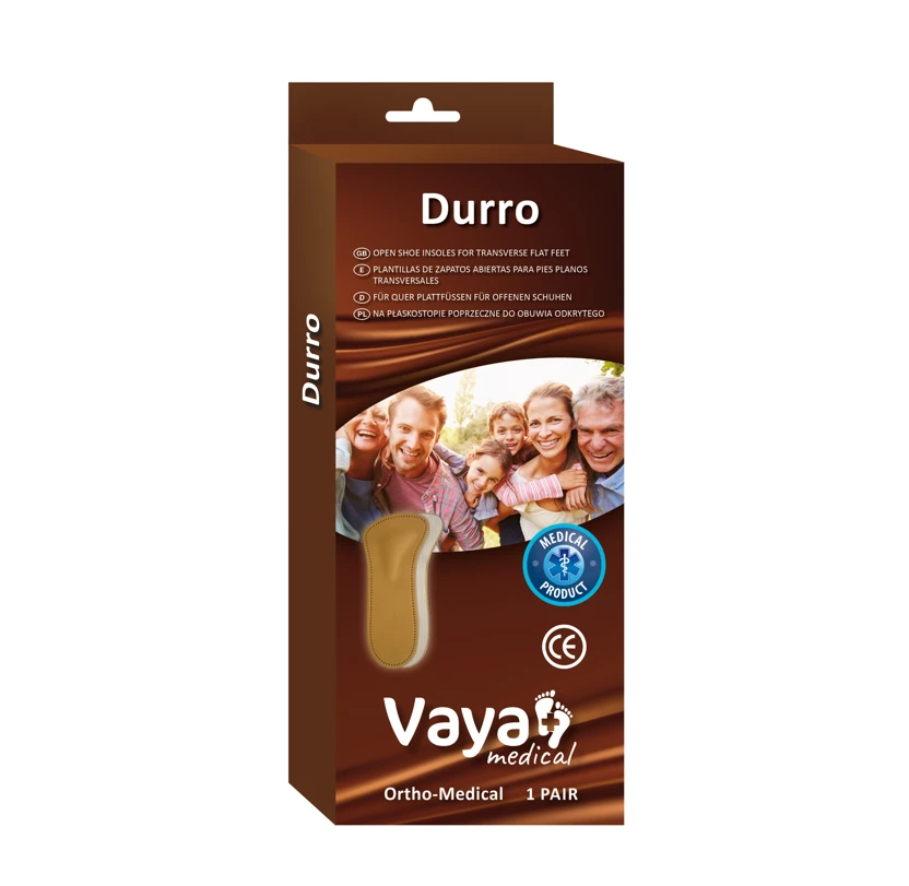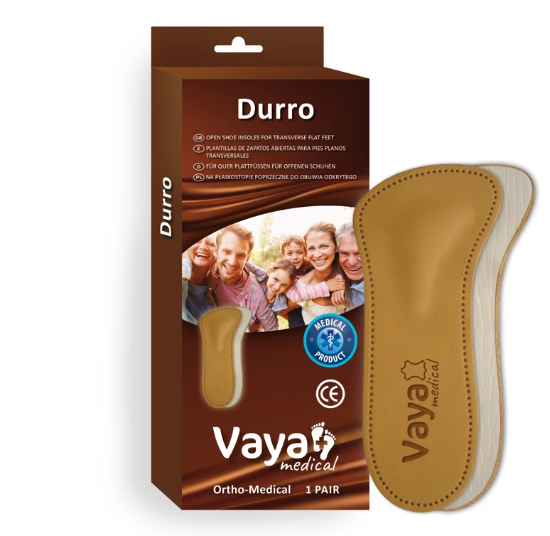 Wkładki ortopedyczne Durro to skórzane wkładki wielokrotnego użycia, przeznaczone są dla stóp z płaskostopiem poprzecznym do wąskiego obuwia. Obniżony fizjologiczny łuk poprzeczny, który występuje przy płaskostopiu jest redukowany przez pelotę. Wkładka wspiera łuk śródstopia, zmienia rozłożenie sił nacisku przedstopia, zmniejsza dolegliwości bólowe i ryzyko wystąpienia odcisków i modzeli. Dzięki wbudowanemu elementowi amortyzującemu piętę, wkładka redukuje mikro wstrząsy podczas chodzenia po twardym podłożu. Jeśli masz problem z płaskostopiem poprzecznym, to proponowane wkładki Durro będą dla Ciebie doskonałym rozwiązaniem. Zapobiegają zmęczeniu stóp, odciążają i amortyzują śródstopie. Przyniosą ulgę w bólu osobom, których źródłem problemu jest obniżenie łuku poprzecznego stopy często związanych z niewydolnością mięśni i więzadeł. Durro są produktami kontynuującymi tradycje wkładek Scholl.