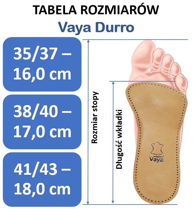 Wierzchnia warstwa wkładek ortopedycznych Vaya Durro wykonana jest z miękkiej garbowanej roślinnie owczej skóry o doskonałych właściwościach higienicznych. Cienka, oddychająca spodnia warstwa z anty poślizgowego lateksu zapewnia wyjątkowy komfort i elastyczność podczas chodzenia. Pomiędzy nimi wbudowana jest pelota w kształcie litery T z naturalnego lateksu, która podpiera łuk poprzeczny stopy oraz zapobiega ześlizgiwaniu się stopy ku przodowi buta. Krążek amortyzujący piętę, skutecznie zapobiega zmęczeniu stóp. Wkładka odciąża mięśnie , ścięgna i więzadła. Wkładki z naszej oferty posiadają certyfikat CE dla wyrobów medycznych tym samym gwarantując bezpieczeństwo stosowania użytkownikom.