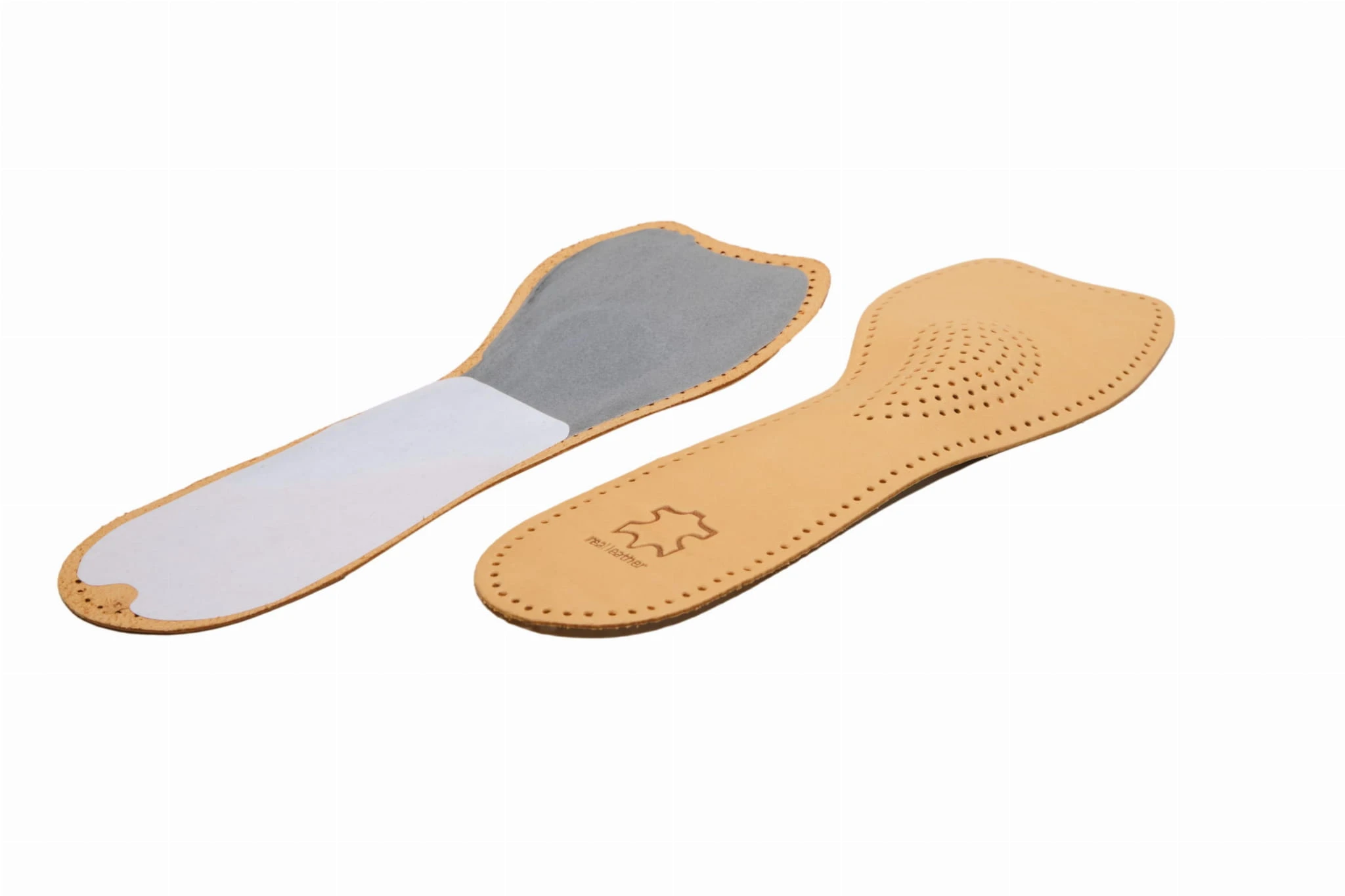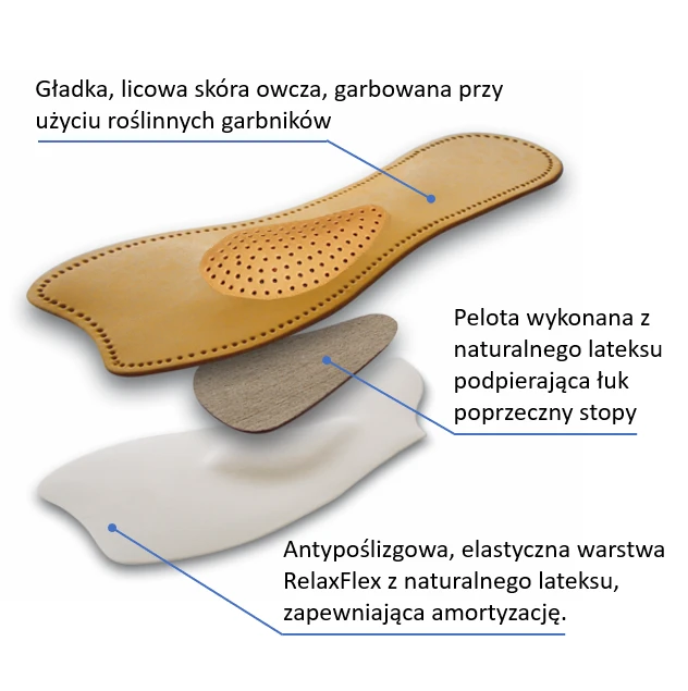 Wierzchnia warstwa wkładek ortopedycznych Vaya Exclusivo wykonana jest z miękkiej garbowanej roślinnie owczej skóry o doskonałych właściwościach higienicznych. Cienka, oddychająca spodnia warstwa z anty poślizgowego lateksu zapewnia wyjątkowy komfort i elastyczność podczas chodzenia. Pomiędzy nimi jest wbudowana korygująca pelota z naturalnego lateksu, która podpiera poprzeczny łuk stopy. Wkładka odciąża mięśnie, ścięgna i więzadła.